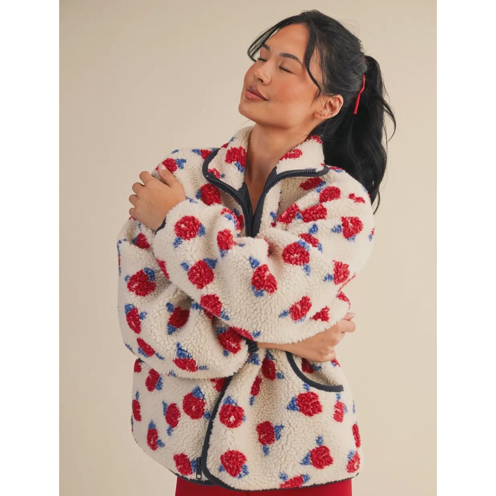 Sweet florals meet snug sherpa. The Fleur & Fleece Jacket combines soft cream sherpa with tufted red and blue blooms for a statement that’s both bold and cozy.