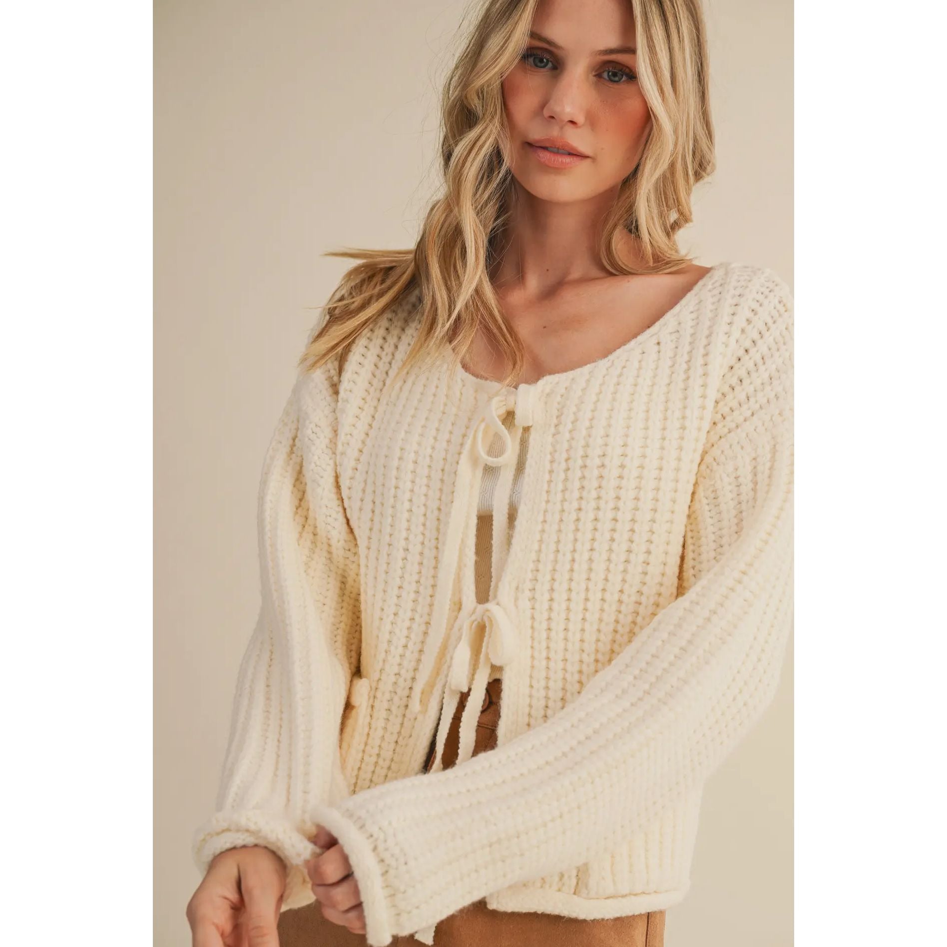 Soft, simple, and oh-so-sweet — The Sweetheart Tie Cardigan is the cozy layer your fall wardrobe’s been waiting for. Featuring a chunky ribbed knit, dainty front tie closures, and a dreamy cream hue, this cardigan brings a touch of charm to any outfit. Pair it with your favorite tank and mini skirt for that effortless “girl next door” look or throw it over a dress for those cozy-cute days.
