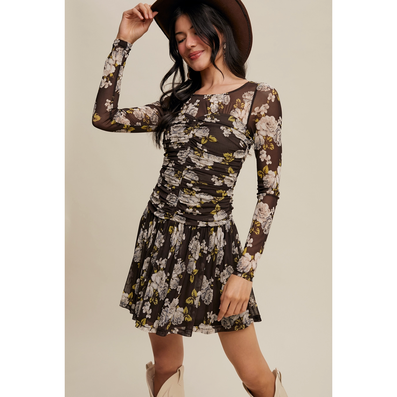 Bloom meets boho in the Wildflower Mini. This long-sleeve mesh dress features a ruched bodice that flatters every curve, paired with a flirty flowy skirt that moves with you. The chocolate base blooms with soft ivory and golden florals, making it the perfect day-to-night piece.